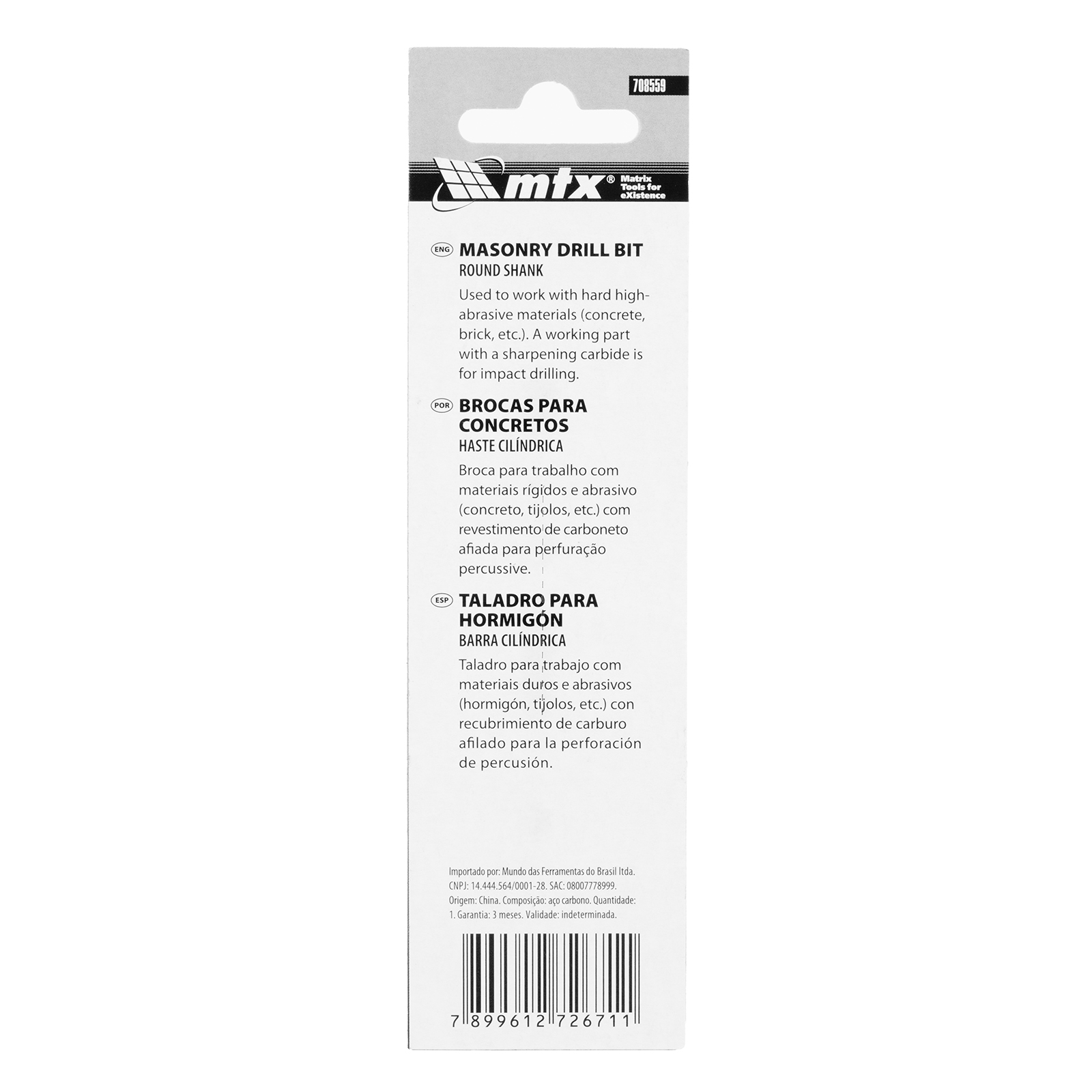 A Broca MTX 708559 é, assim, uma ferramenta indispensável para profissionais e entusiastas que procuram eficiência, durabilidade e precisão em suas tarefas de perfuração. Seu design robusto e materiais de alta qualidade garantem um desempenho excepcional em uma variedade de aplicações, tornando-a uma escolha confiável para todos os tipos de projetos de construção, reforma ou instalação doméstica.