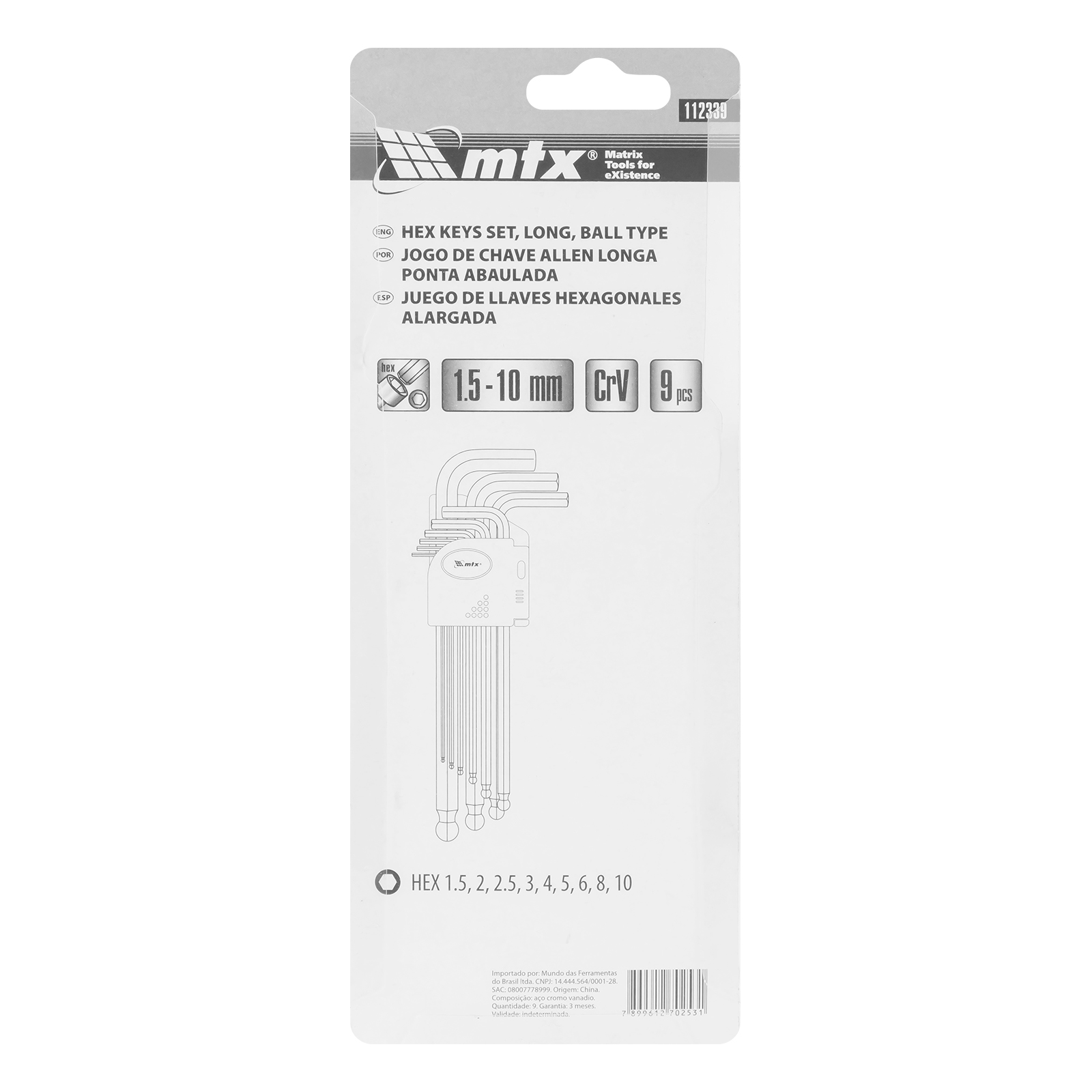 Jogo de Chave Allen Longa Abaulada 1,50-10,00mm 9pçs Mtx
