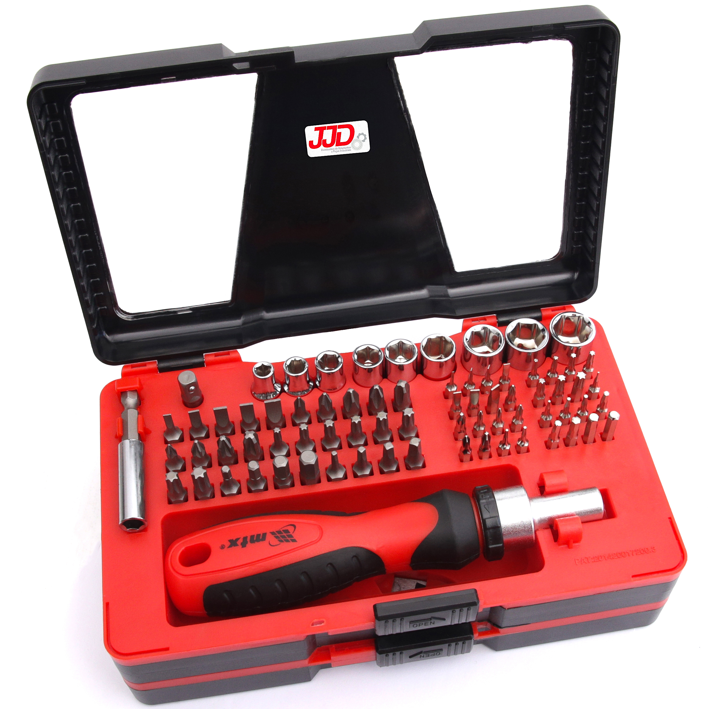 O jogo universal de bits e soquetes são ideais para a instalação e remoção de ligações roscadas. O jogo inclui uma chave de fenda com mecanismo reversível, o que aumenta o conforto e a velocidade de desempenho do trabalho. Inclui bits e soquetes de vários tamanhos, feitos de aço cromo-vanádio. Para fácil armazenagem e transporte o jogo é embalado em caixa de plástica.