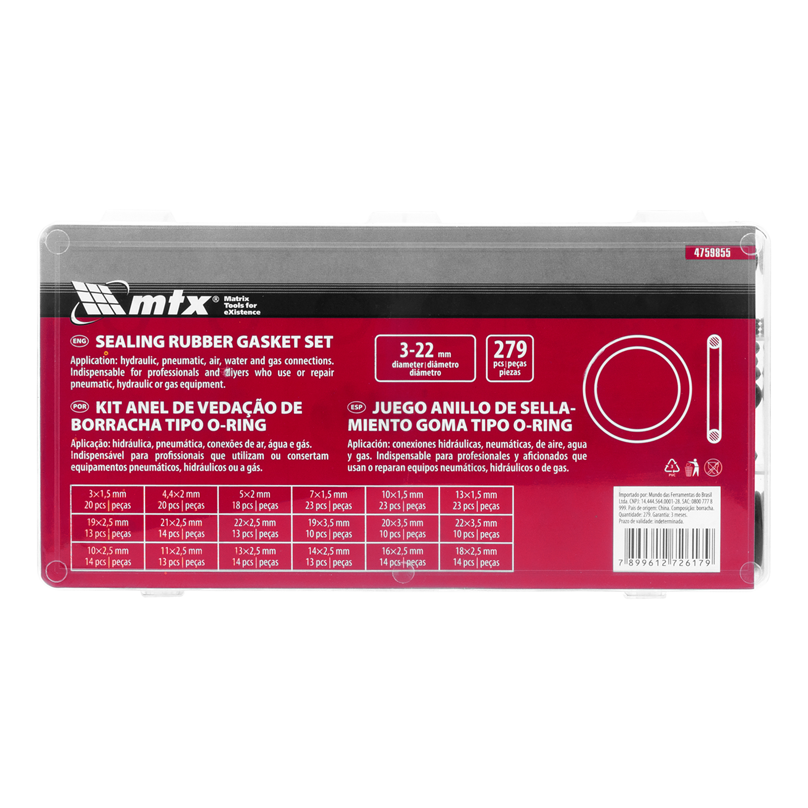 Kit de Anel Vedação Borracha 03 -22mm 279 Peças – MTX