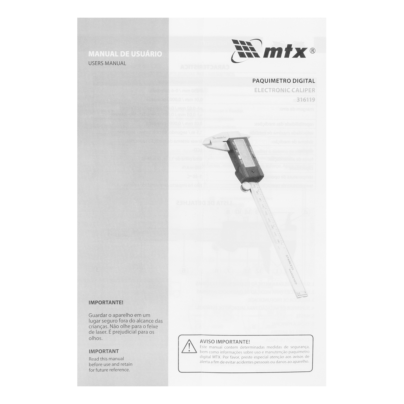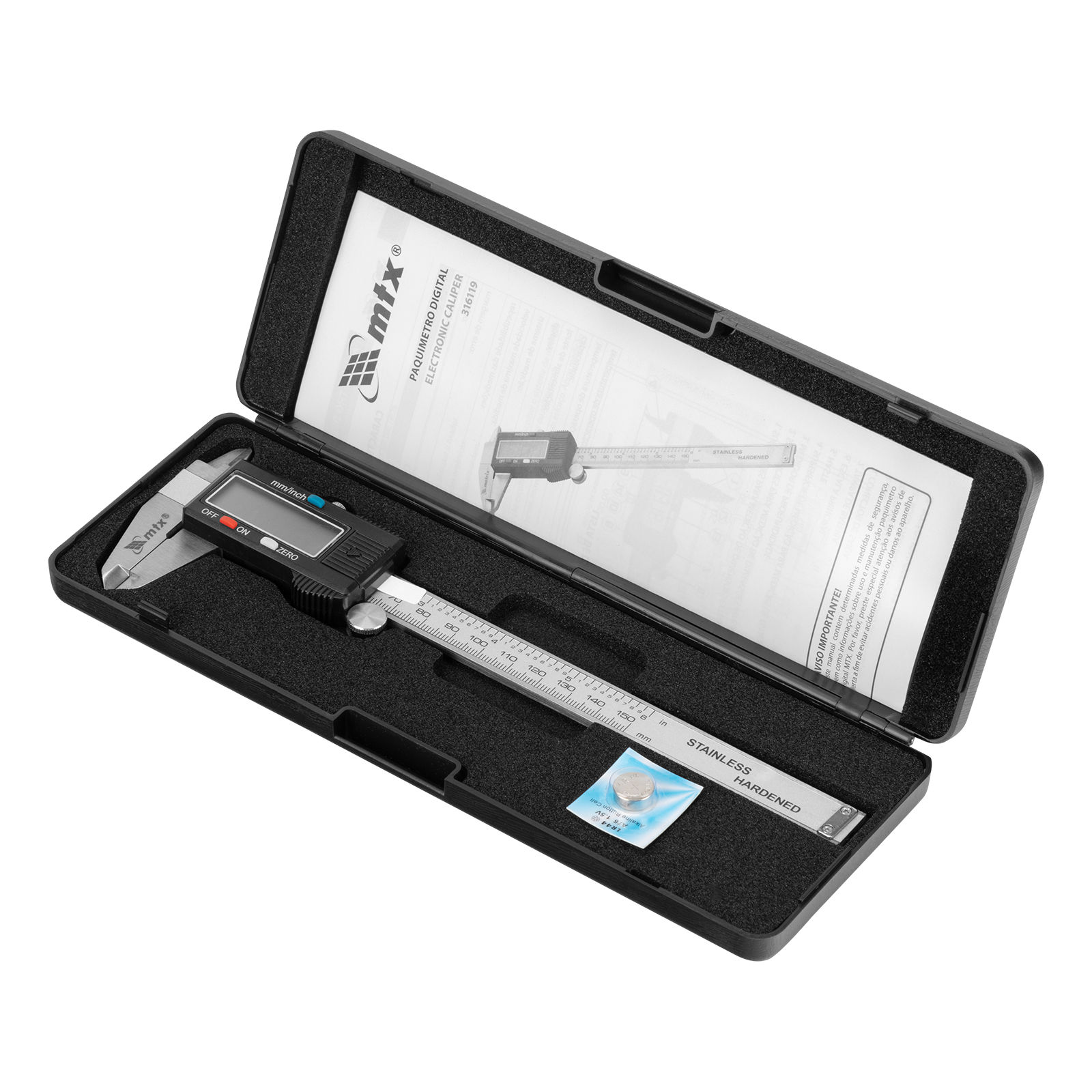 Durabilidade com Aço Inoxidável: Fabricado em aço inoxidável resistente à corrosão, o Paquímetro Digital MTX 316119 é construído para durar, assegurando uma longa vida útil mesmo sob uso frequente e em ambientes exigentes.